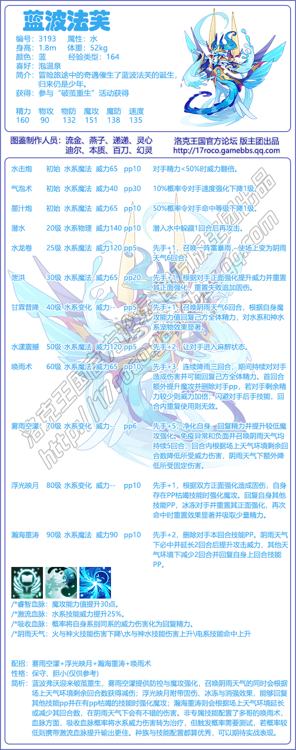 1、洛克王国蓝波法芙技能配招:雾雨空濛+浮光映月+瀚海重涛+唤雨术。