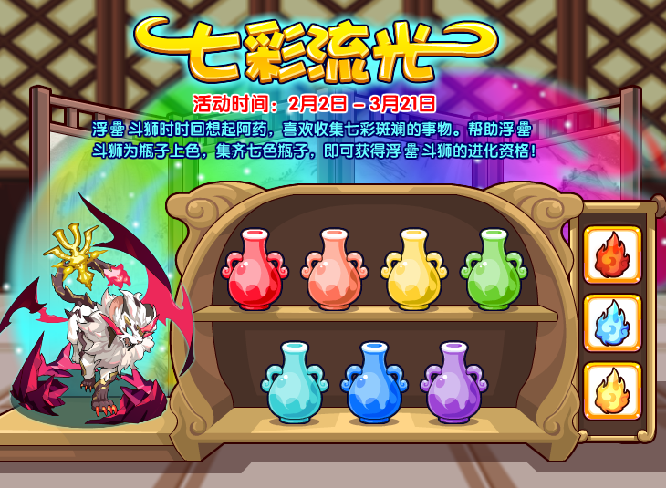 浮罍斗狮时时回想起阿药,喜欢收集七色斑斓的事物。帮助浮罍斗狮为瓶子上色,集齐七色瓶子,即可获得浮罍斗狮的进化资格!
