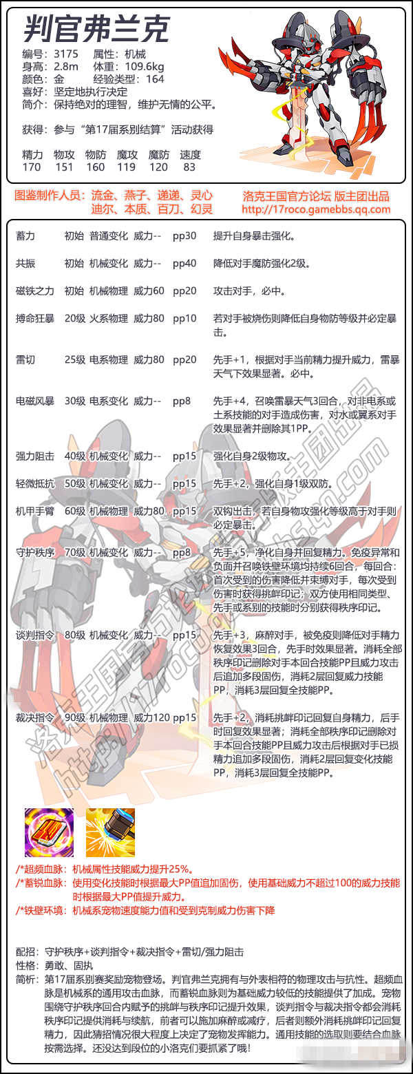 1、洛克王国判官弗兰克技能配招:守护秩序+谈判指令+裁决指令+雷切力阻击。