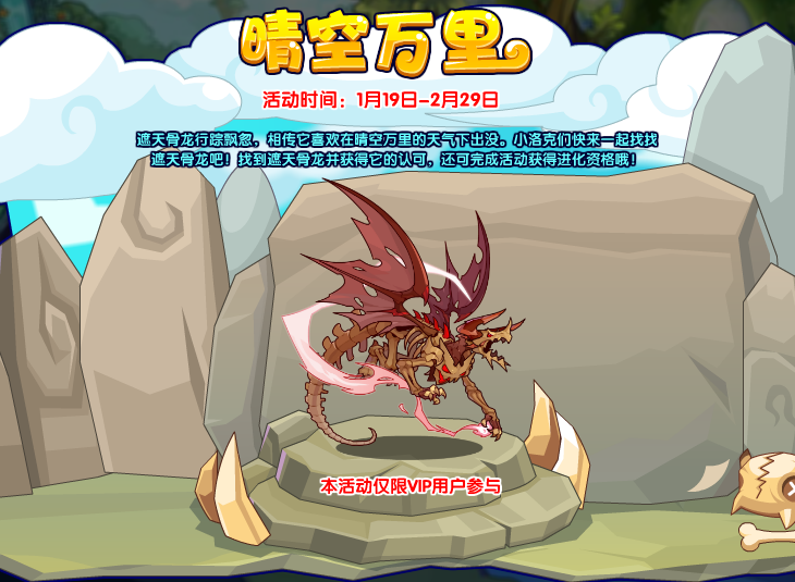 遮天骨龙行踪飘忽,相传它喜欢在晴空万里的天气下出没。小洛克们快来一起找找遮天骨龙吧!找到遮天骨龙并获得它的认可,还可完成活动获得进化资格哦!(本活动仅限VIP用户参与)