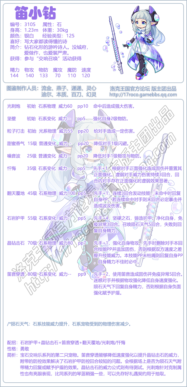 今日给大家带来了《洛克王国》笛小钻技能表图鉴分享,笛小钻编号是3105物攻宠物,这个宠物喜欢写大家都读得懂的诗,钻石化形的游吟诗人。没城府,爱做作,也爱装严肃。下面分享技能表种族值可以让大家快速了解这个宠物各项信息,感兴趣的速来围观吧!