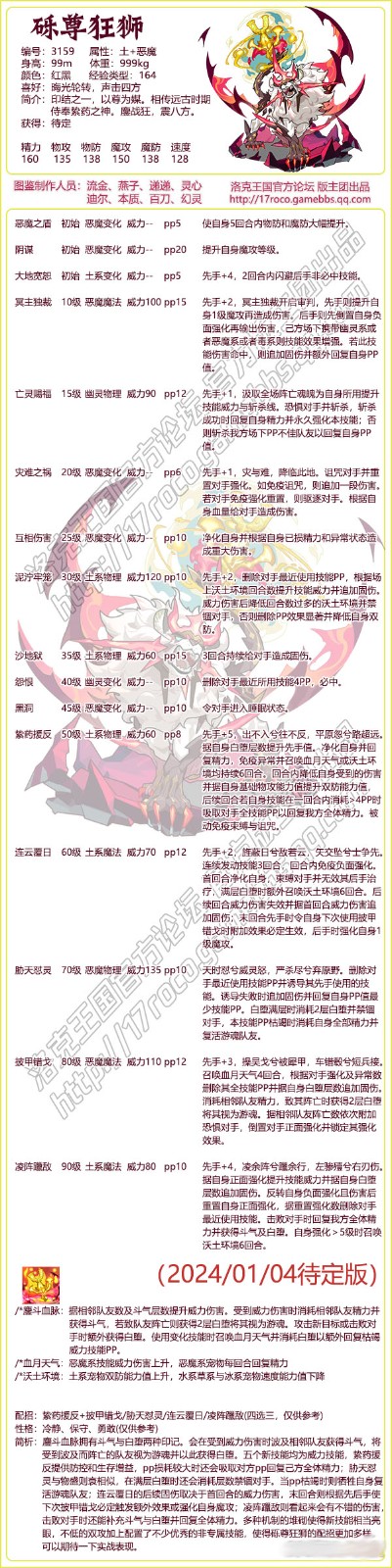 今日给大家带来了《洛克王国》砾尊狂狮技能表图鉴分享,砾尊狂狮是编号为3159的魔攻宠物,愿斗血脉拥有斗气与白堕两种印记。会在受到威力伤害时波及相邻队友获得斗气,将受到波及而阵亡的队友视为游魂并以此获得白堕。下面分享技能表种族值可以让大家快速了解这个宠物各项信息,感兴趣的速来围观吧!