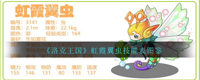 今日给大家带来了《洛克王国》虹霞翼虫技能表图鉴分享,虹霞翼虫编号是3141的物攻宠物,生如夏花,不要因为错过太阳而流泪,等待你的还有雨后的彩虹。下面分享技能表种族值可以让大家快速了解这个宠物各项信息,感兴趣的速来围观吧!