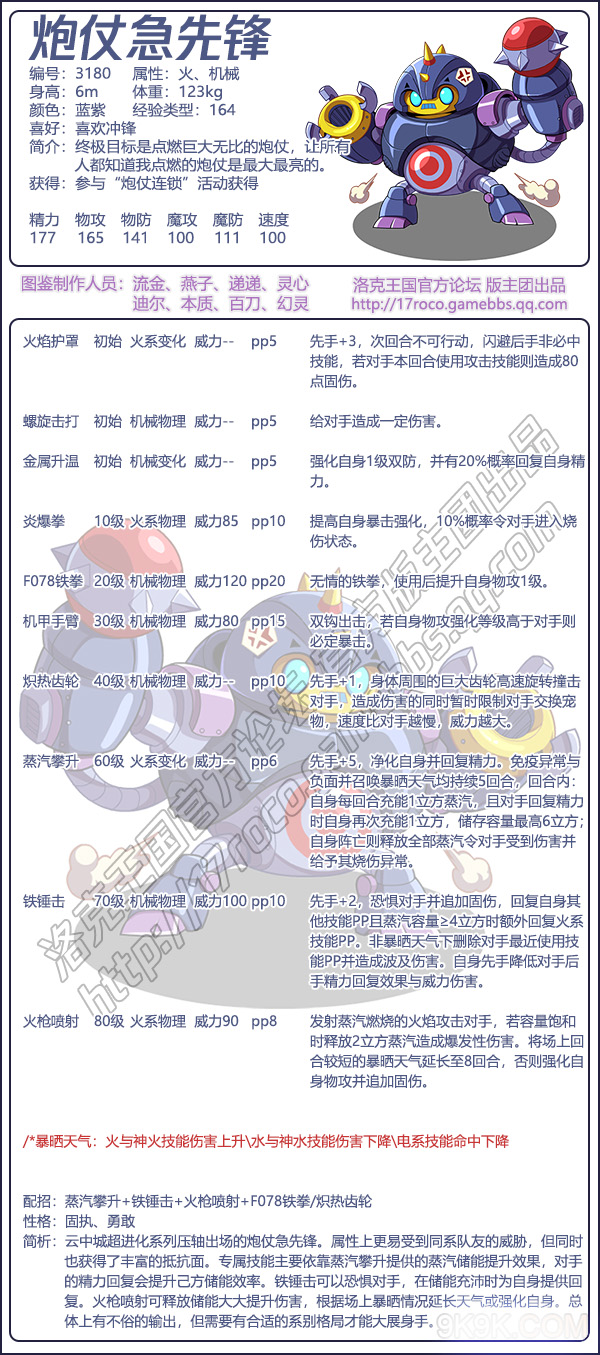 今日给大家带来了《洛克王国》炮仗急先锋技能表图鉴分享,这是编号3180的物攻宠物,这是云中城超进化系列压轴出场的炮仗急先锋。属性上更易受到同系队友的威胁,但同时也获得了丰富的抵抗面。下面分享技能表种族值可以让大家快速了解这个宠物各项信息,感兴趣的速来围观吧!