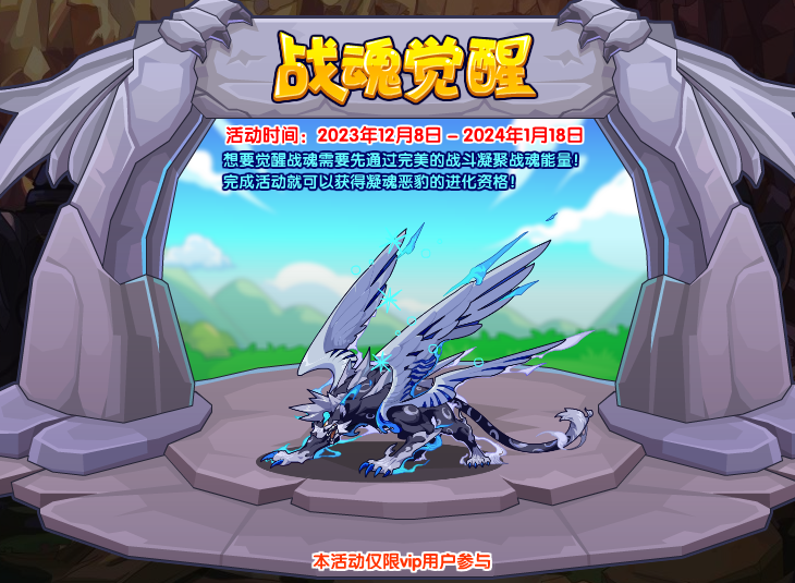 飞天翼豹的梦想就是觉醒战魂,然而觉醒战魂需要通过不停地战斗磨砺,跟它一起坚持下去吧!完成活动可以获得凝魂恶豹的进化资格!(本活动仅限vip用户参与)