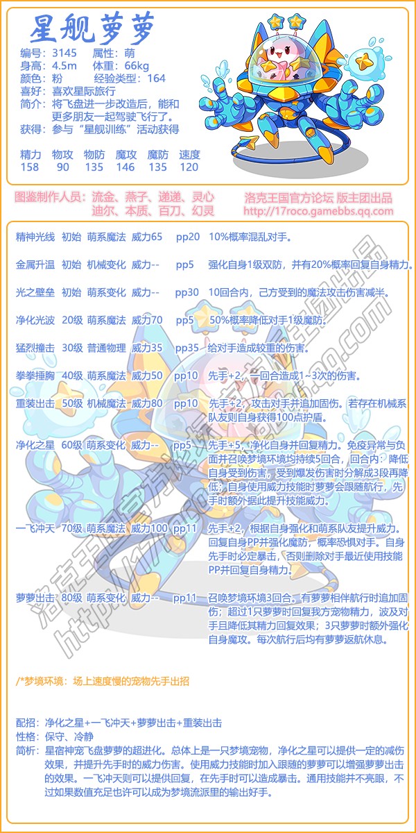 洛克王国星舰萝萝是编号3145的萌属性的魔攻宠物,星宿神宠飞盘萝萝的超进化。总体上是一只梦境宠物,净化之星可以提供一定的减伤效果,并提升先手时的威力伤害。下面是小编给大家带来的《洛克王国》星舰萝萝技能搭配推荐,配招推荐:净化之星+一飞冲天+萝萝出击+重装出击。