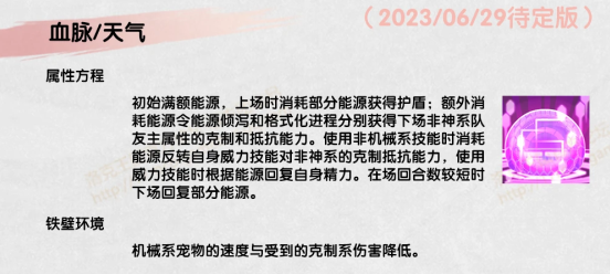 2.属性方程血脉为御械女帝提供了上场时的护盾效果,为自身两个专属机械系威力技能照予上次在场队友主展性对应的克制或抵抗关系,配合非机械技能反转克制