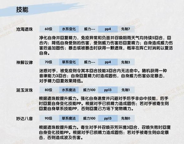 3.妙达八音召唤芬芳环境失败时可以获得回复,根据寄生成功与否可以触发柔击或波及效果。从系别和技能效果来看是单纯的输出宠物,在天气战中会更具优势。