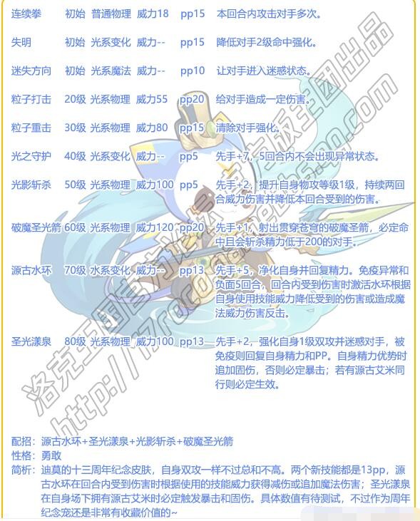 3、迪莫的十三周年纪念皮肤,自身双攻一样不过总和不高。两个新技能都是13pp,源古水环在回合内受到伤害时根据使用的技能威力获得减伤或追加魔法伤害。