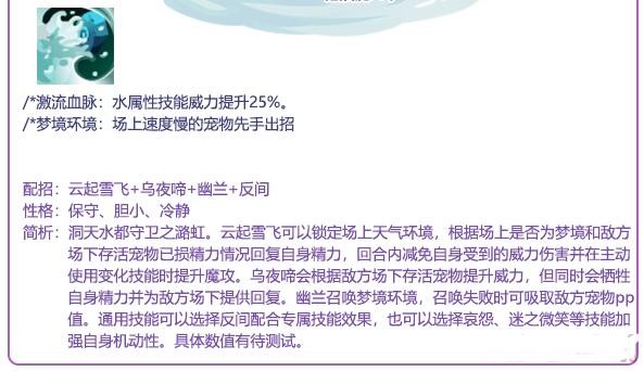 4、洞天水都守卫之潞虹,云起雪飞可以锁定场上天气环境,根据场上是否为梦境和敌方场下存活宠物已损精力情况回复自身精力,回合内减免自身受到的威力伤害并在主动使用变化技能时提升魔攻。
