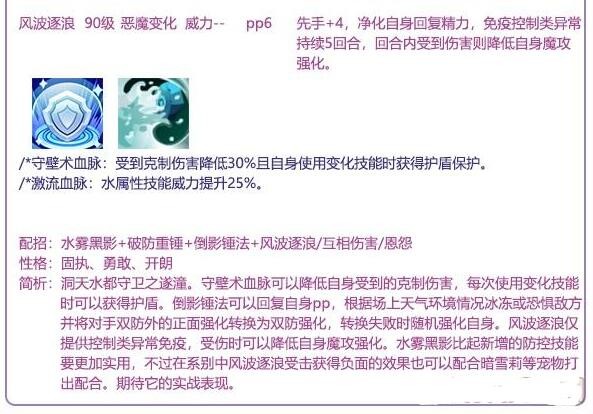 5、风波逐浪仅提供控制类异常免疫,受伤时可以降低自身魔攻强化。水雾黑影比起新增的防控技能要更加实用,不过在系别中风波逐浪受击获得负面的效果也可以配合暗雪莉等宠物打出配合。