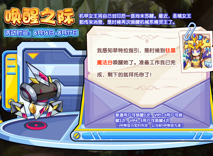 机甲女王将自己封印后一直尚未苏醒。最近,圣域女王那边传来消息,是时候再次唤醒机械系精灵王了。