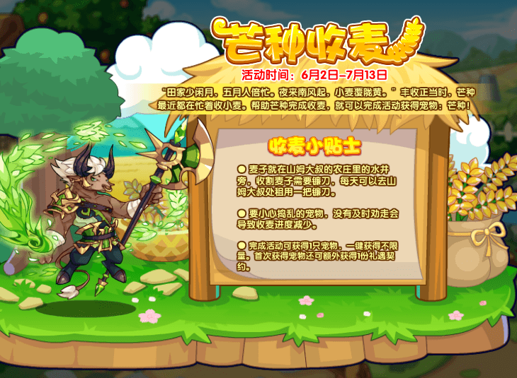 丰收正当时,芒种最近都在忙着收小麦。帮助芒种完成收麦,就可以完成活动获得宠物:芒种!