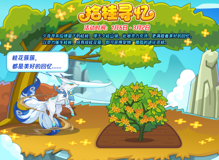 少音寻来应律留下的桂枝,埋于夕桂山坡。此地灵力充沛、更满载着美好的回忆。以灵力催生桂枝,培育成桂花蔟,即可获得宠物:雝狐的进化资格。