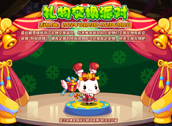 最近枫雪镇举办了礼物交换派对,与来参加派对的小宠物们交换礼物有机会获得“特别信物”,拥有足够的特别信物即可兑换指定宠物,快来交换礼物吧!