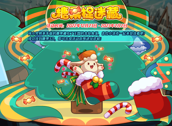 袜小兜将亲手做的糖果藏在了王国的各处角落,各位小洛克一起来找找看吧!成功找到糖果3次,即可完成活动获得进化资格!
