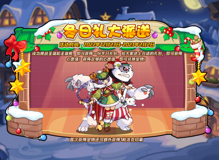 成功挑战圣诞和圣诞熊,即可获得一份冬日礼包。给大家送上合适的礼包,获取心愿值,即可兑换宠物:圣诞、圣诞熊!