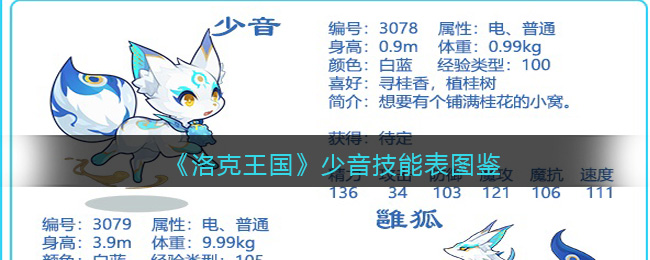 洛克王国游戏中少音是奉神系列宠物,进化路线为少音→雝狐→金鸣之狐→青钟翾狐!下面手游网小编就给大家带来了《洛克王国》少音技能表图鉴,技能表种族值可以让大家快速了解这个宠物各项信息,感兴趣的速来围观吧!