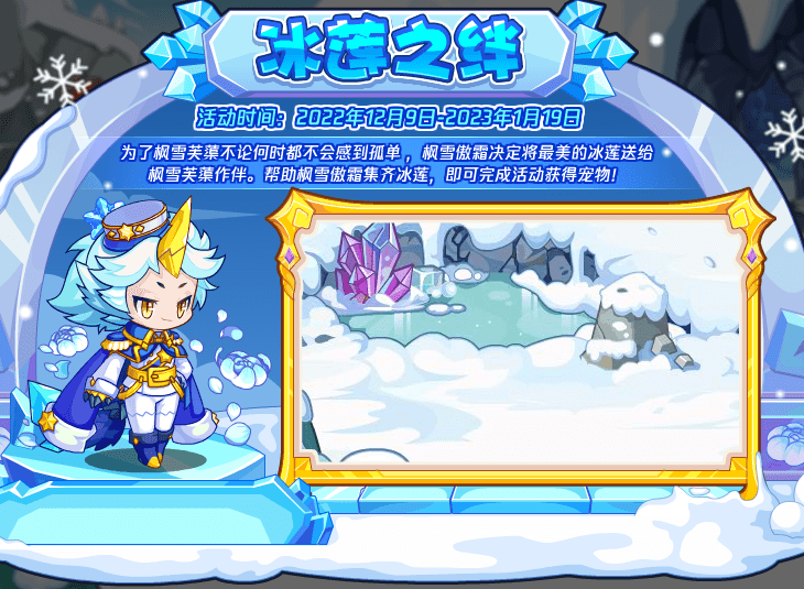 为了枫雪芙蕖不论何时都不会感到孤单,枫雪傲霜决定将最美的冰莲送给枫雪芙蕖作伴。帮助枫雪傲霜集齐冰莲,即可完成活动获得宠物!