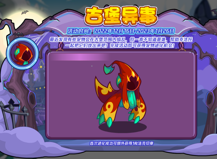 最近发现有些宠物会在古堡范围内捣乱,但一直不知道是谁,帮助克洛托一起把它们找出来吧!完成活动即可获得宠物进化机会!