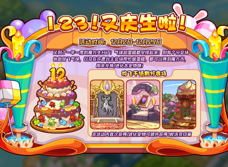 又到了一年一度的魔方生日了!气球和蛋糕都安排起来!到每个分会场协助放飞气球,以及在许愿台主会场帮忙做蛋糕,都可以得到魔方币!用魔方币可以兑换各宠物哦!