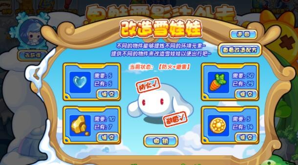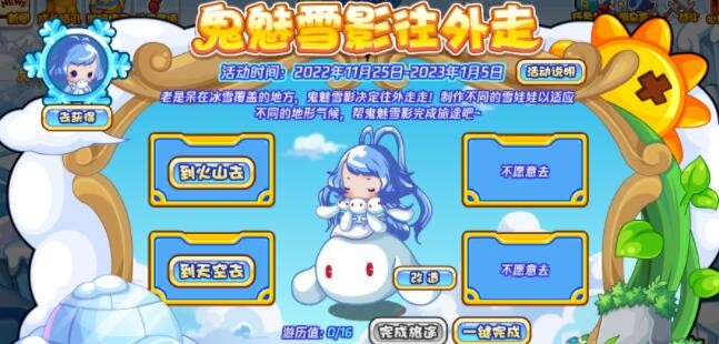 老是呆在冰雪覆盖的地方,鬼魅雪影决定往外走走!制作不同的雪娃娃以适应不同的地形气候,帮鬼魅雪影完成旅途吧~!(进化需准备满级的魅小妹,本活动仅限vip用户参与哦!)