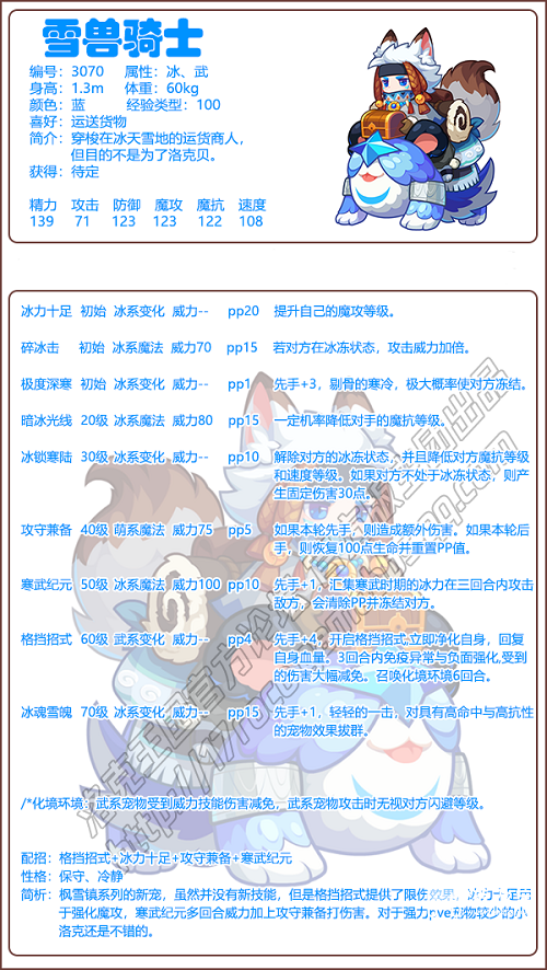 3、简析:枫雪镇系列的新宠,虽然并没有新技能,但是格挡招式提供了限伤效果,冰力十足用于强化魔攻,寒武纪元多回合威力加上攻守兼备打伤害。对于强力pve宠物较少的小洛克还是不错的。