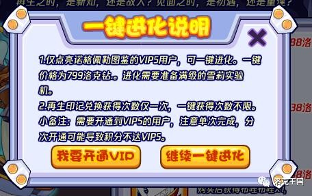 如果想通过【一键进化】方式获得进化资格,点击【一键进化】可以查看说明,仅点亮诺格佩勒图鉴的VIP5用户才可一键进化。大家可以进行规划后按照自己的需求选择不同的方式。