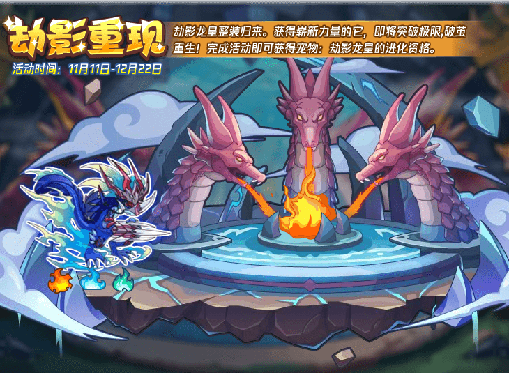劫影龙皇整装归来。获得崭新力量的它,即将突破极限,破茧重生!完成活动即可获得宠物:劫影龙皇的进化资格。