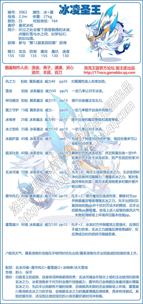 1、洛克王国冰凌圣王技能配招玄冰河魂+霜华风刀+覆雪凝川+冰吃哮/冰天雪地