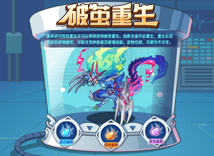 皇家研究院的重生仪可以帮助宠物蜕变重生。劫影龙皇开启重生,重生后会有新的宠物编号,可能改变种族值及新增技能。宠物性格、天赋均不改变。