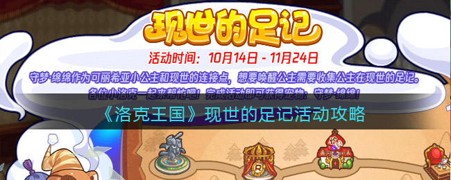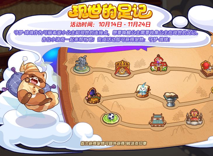 守梦·绵绵作为可丽希亚小公主和现世的连接点,想要唤醒公主需要收集公主在现世的足记。各位小洛克一起来帮忙吧!完成活动即可获得宠物:守梦·绵绵!