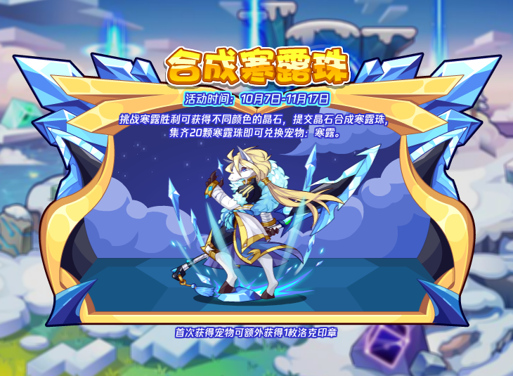 挑战寒露胜利可获得不同颜色的晶石,提交晶石合成寒露珠,集齐20颗寒露珠即可兑换宠物:寒露。
