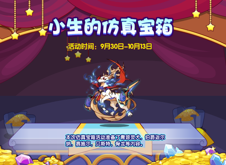 2022年9月30日-10月13日《洛克王国》新一期的小生的仿真宝箱上线,活动地点在时尚都市,活动中可以获得:青琼灵犬,伯爵迦尔纳,赛施尔,贝斯特,骨龙等宠物。下面手游网小编就给大家带来了《洛克王国》小生的仿真宝箱攻略10月一览,想要了解详情的一起看看吧!