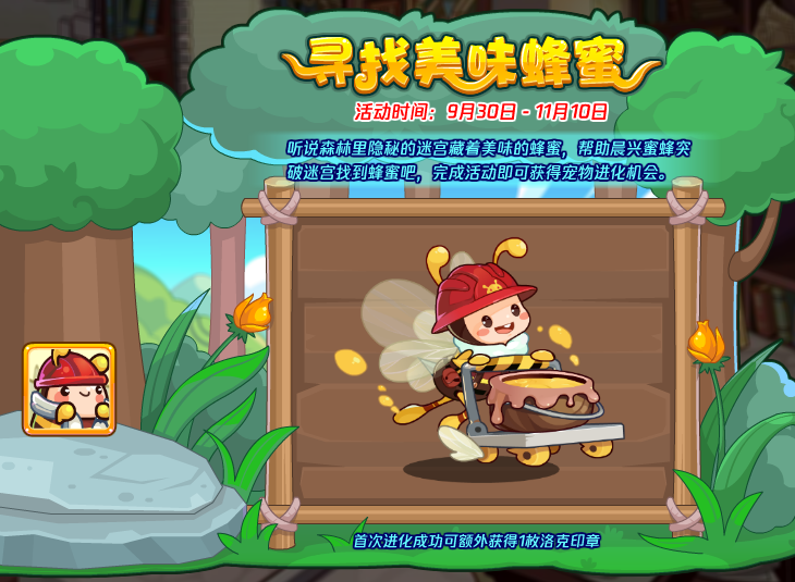 听说森林里隐秘的迷宫里藏着美味的蜂蜜,帮助晨兴蜜蜂突破迷宫找到蜂蜜吧,完成活动即可获得宠物进化机会。