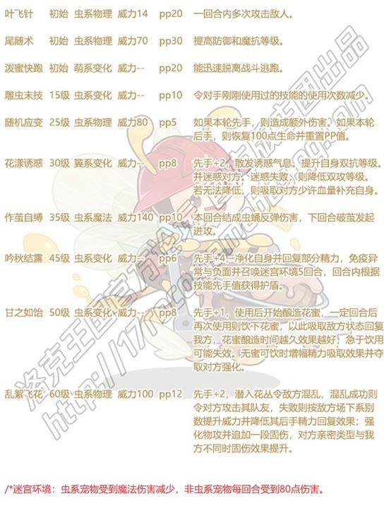 3.勤劳蜜蜂超进化。是否能担任输出手要看乱絮飞花威力增幅与固伤效果如何。甘之如饴大概是按两次使用相隔的回合吸取对方状态,具体效果有待测试。第四技能主推雕虫末技有助于消耗对方pp,作茧自缚也许能靠反伤打个出其不意。