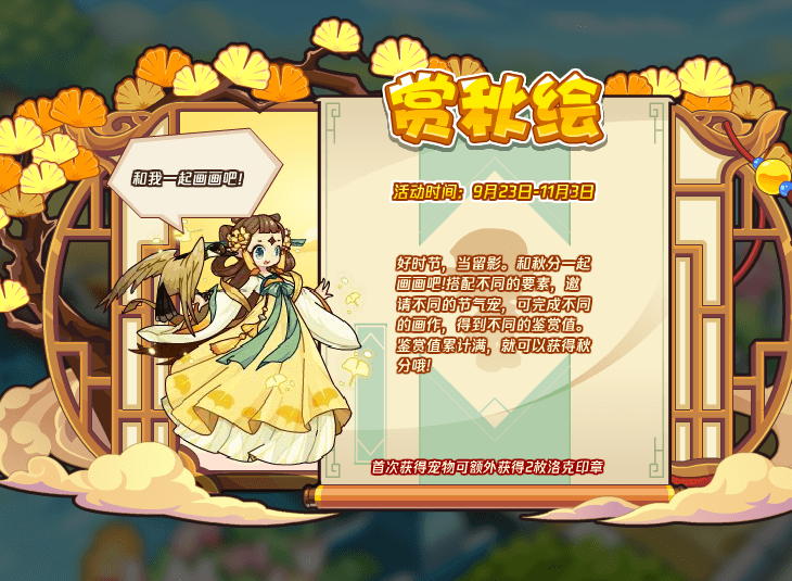 好时节,当留影。和秋分一起画画吧!搭配不同的要素,邀请不同的节气宠,可完成不同的画作,得到不同的鉴赏值。鉴赏值累计满,就可以获得秋分哦!