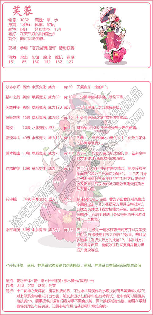 3、简析:十二花神之芙蓉花,魔攻种族优秀,不过水柱涟漪作为水系技能而且基础威力较低,对上草系宠物难以打出伤害,触发多道水柱的条件也有待测试;花中镜可以回复其他技能pp,后手提供护盾和闪避对手下回合技能,因此推荐减速性格。能否在系别赛场发挥还有待实战。记得参与每周活动获得印章兑换哦~