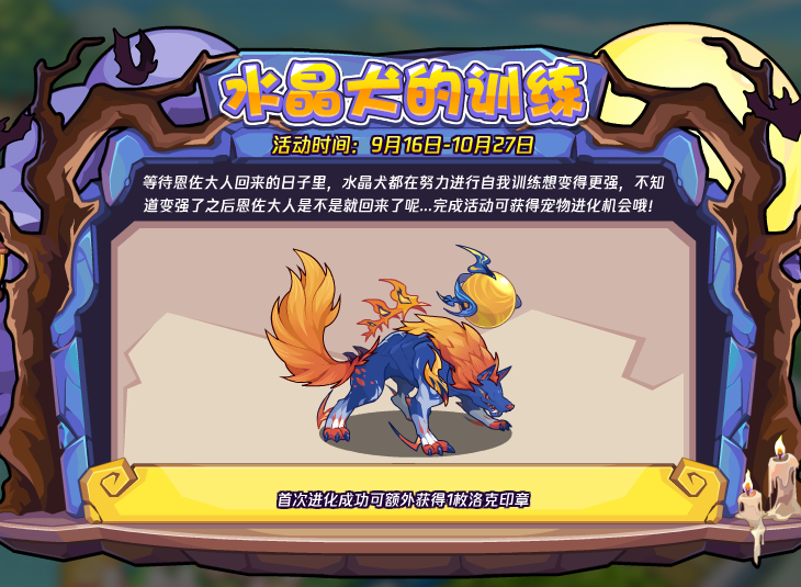 等待恩佐大人回来的日子里,水晶犬都在努力进行自我训练想变得更强,不知道变强了之后恩佐大人是不是就回来了呢……完成活动可获得宠物进化机会哦!