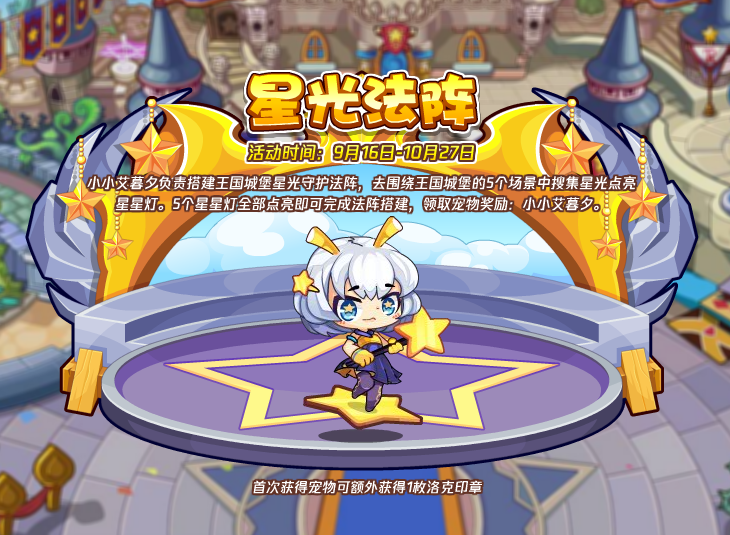 小小艾暮夕负责搭建王国城堡星光守护法阵,去围绕王国城堡的5个场景中搜集星光点亮星星灯。5个星星灯全部点亮即可完成法阵搭建,领取宠物奖励:小小艾暮夕。