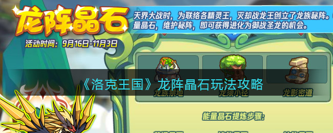 洛克王国龙阵晶石怎么玩?9月16日-10月27日大家进入活动地图【隐龙之谷】可参与活动,收集能量晶石,维护秘阵,即可获得进化为御战圣龙的机会。下面是小编给大家带来的《洛克王国》龙阵晶石玩法攻略,感兴趣的小伙伴们一起来看看吧。