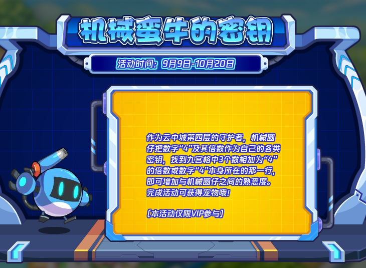 作为云中城第四层的守护者,机械圆仔把数字“4”及其倍数作为自己的各类密钥,找到九宫格中3个数相加为“4”的倍数或数字“4”本身所在的那一行,即可增加与机械圆仔之间的熟悉度。完成活动可获得宠物哦!(本活动仅限VIP参与)