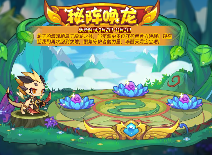 龙王的魂魄栖息于隐龙之谷,当年曾由多位守护者合力唤醒!现在让我们再次回到故地,聚集守护者的力量,唤醒天龙宝宝吧!