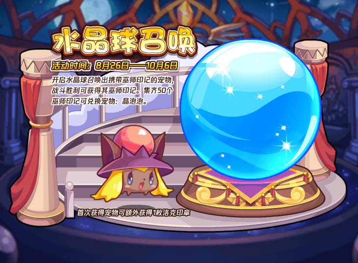 开启水晶球召唤出携带巫师印记的宠物,战斗胜利可获得其巫师印记。集齐50个巫师印记可兑换宠物:晶泡泡(可自然进化为水晶巫师)。