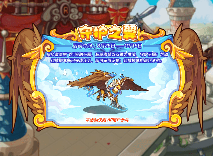 肩负着皇家飞行宠的荣耀,超威狮鹫以双翼为屏障,守护王国!帮助超威狮鹫每日完成任务,即可获得宠物:超威狮鹫的进化资格。(本活动仅限VIP用户参与)