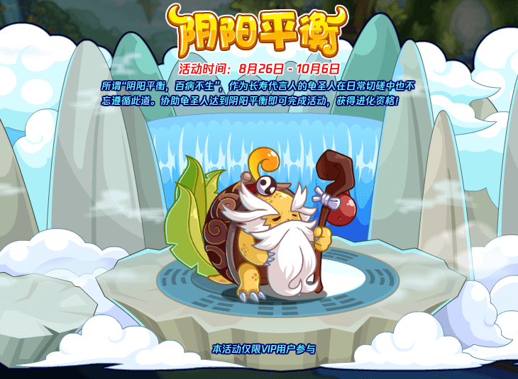 所谓“阴阳平衡,百病不生”,作为长寿代言人的龟圣人在日常切磋中也不忘遵循此道。协助龟圣人达到阴阳平衡即可完成活动,获得进化资格!(本活动仅限vip用户参与)