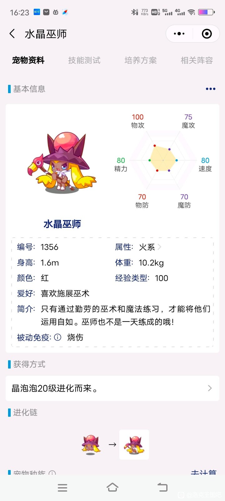 种族值 精力 攻击 防御 魔攻 魔抗 速度 晶泡泡 55 70 45 55 50 60 水晶巫师 80 100 70 75 70 80 技能表 技能 类型 威力 PP 效果 爆击枪 火系魔法 40 25 一定机率让对手进入烧伤状态。 护盾术 普通变化 0 10 保护自己本回合不受伤害,连续使用可能失败。先手+3 乱冲 普通物理 15 20 一回合内给对手多次攻击。 星之雨 普通魔法 60 20 给对手造成一定伤害,100%命中。 火之刃 火系物理 65 15 一定机率让对进入烧伤状态或恐惧状态,两效果不可同时出现。 火焰踢 火系物理 75 15 一定机率让对手进入烧伤状态。 炎爆拳 火系物理 85 10 提高暴击率,一定机率让对手进入到烧伤状态。 三角之力 普通魔法 80 10 强大的魔法攻击,一定机率让对手进入麻醉、烧伤或冰冻状态。 烈焰囤积 火系物理 90 10 提升自身的攻击等级。 烈焰冲锋 火系物理 120 15 一定机率让对手进入烧伤状态,对手受到的伤害一部分反射给自己。