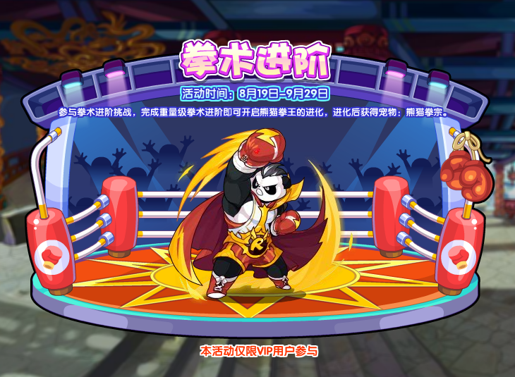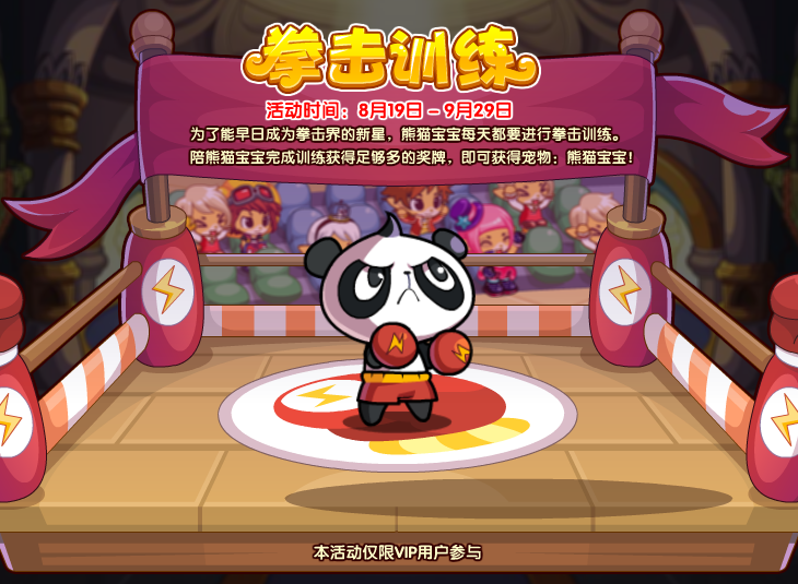 为了能早日成为拳击界的新星,熊猫宝宝每天都要进行拳击训练。陪熊猫宝宝完成训练获得足够多的奖牌,即可获得宠物:熊猫宝宝!(本活动仅限vip用户参与)