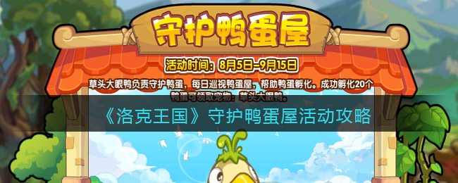 《洛克王国》游戏中守护鸭蛋屋活动即将在8月5日-9月15日上线,每日巡视鸭蛋屋,帮助鸭蛋孵化。成功孵化20个鸭蛋可领取宠物:草头大眼鸭,那么今天小编就给大家介绍一下洛克王国守护鸭蛋屋活动攻略,有需要的小伙伴不要错过了。