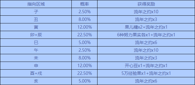①初始幸运时刻是“丑”时(流年之约*3),那么首次刷新(免费)后幸运时刻会在“亥”时和“巳”时(流年之约*6)中随机,再次刷新(800洛克贝)后幸运时刻将会在“子”时和“午”时(流年之约*10)中随机;